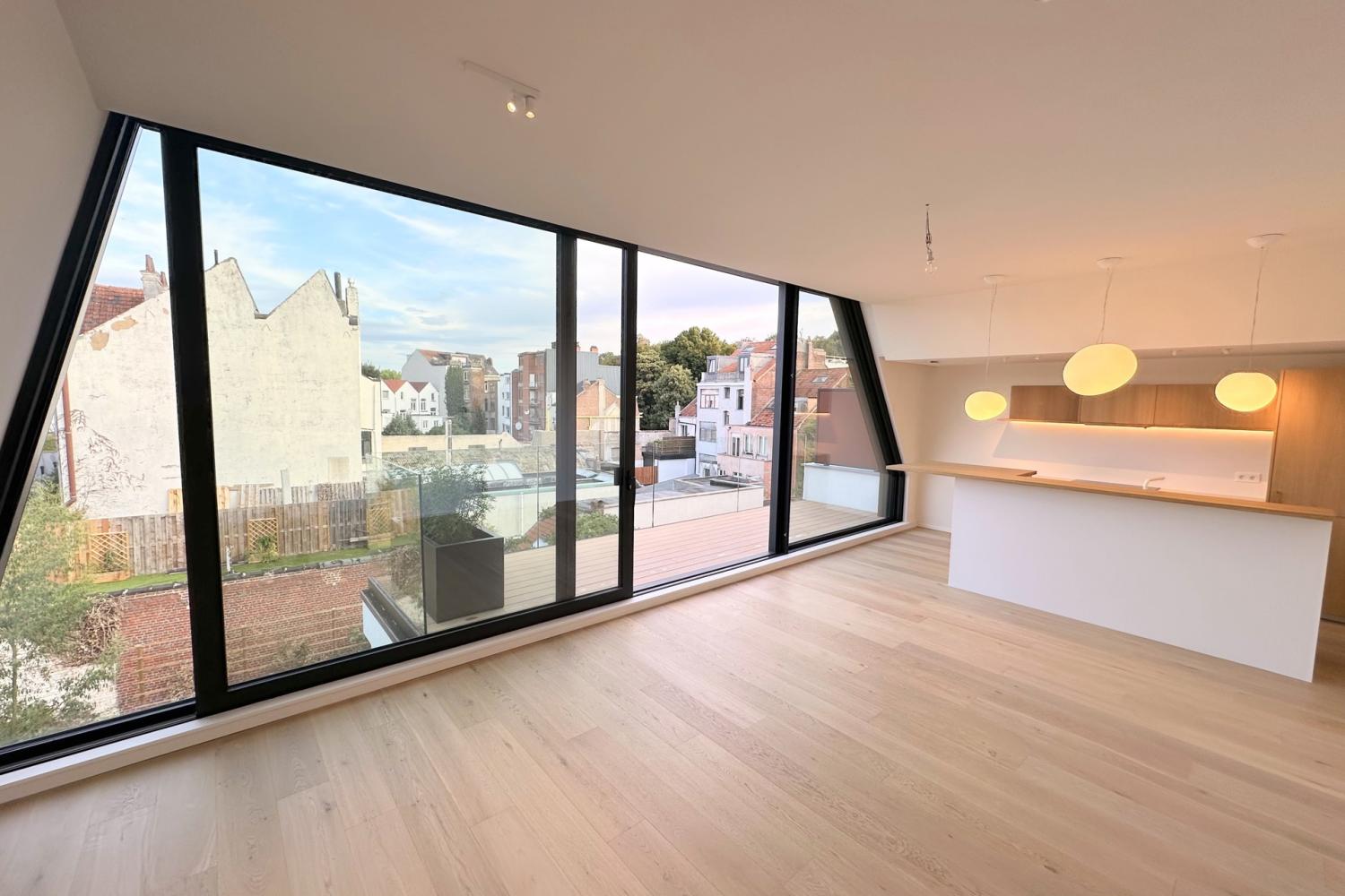 Close to Bois de la Cambre, near all amenities such as schools and shops, in a new small building with four flats, beautiful penthouse of approx. 106 m² + terrace of approx. 10 m² located on the third floor. Beautiful reception room, fully equipped kitchen, 2 bedrooms, 2 shower rooms. Bicycle parking. Lift. PEB (energy performance certificate) in progress. VAT regime.