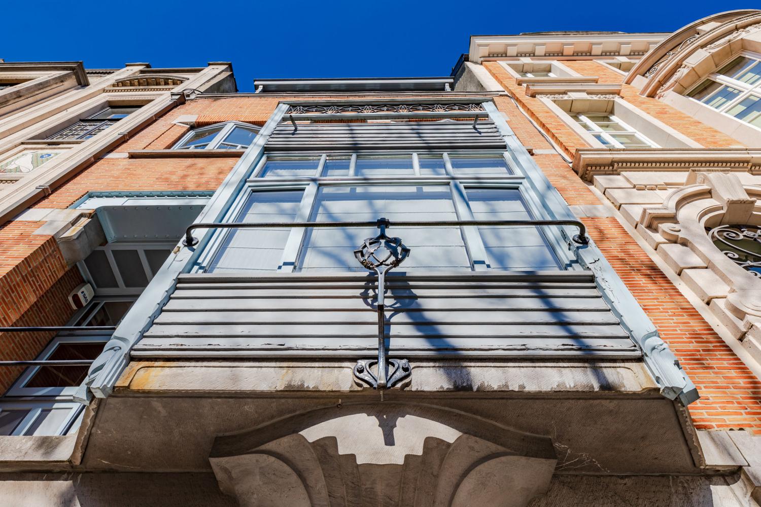 Dit prachtige maison de maître ligt aan de prestigieuze Avenue Molière en valt meteen op door zijn opmerkelijke gevel uit 1912, ontworpen door architect Antoine Pompe. Het is de perfecte belichaming van de Art Nouveau-geest, met zijn combinatie van rode baksteen en blauwe steen, hangende boogramen, grote ramen en origineel houtwerk dat lichtblauw is geschilderd.