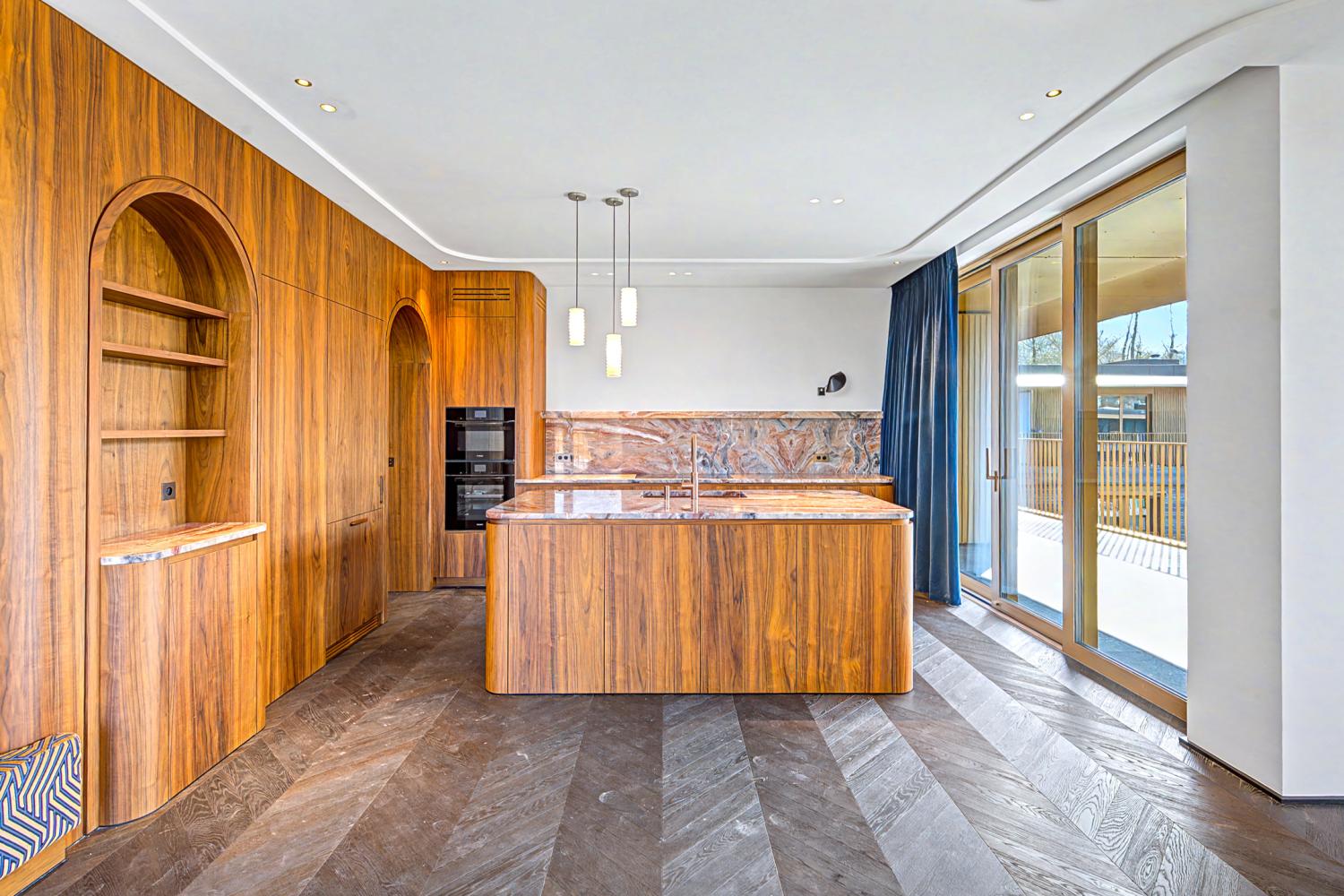 De open, volledig uitgeruste keuken is georganiseerd rond een prachtig centraal marmeren eiland met hoogwaardige afwerkingen, wat een gevoel van elegantie en verfijning toevoegt aan het geheel.
